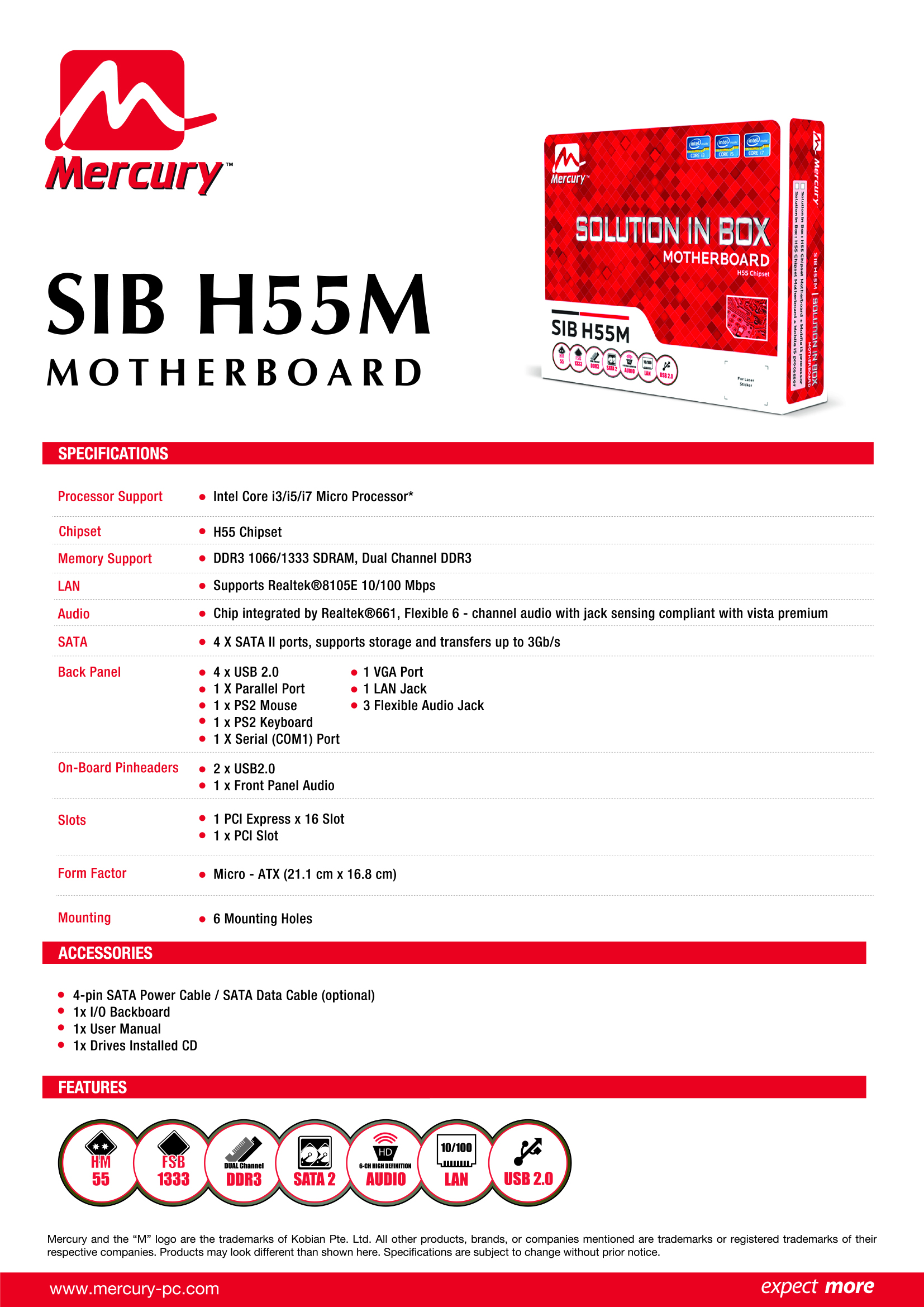 Mercury H55M Works with Built-in Intel Core i3 processors. Also supports Dual Channel DDR3, USB2.0